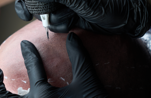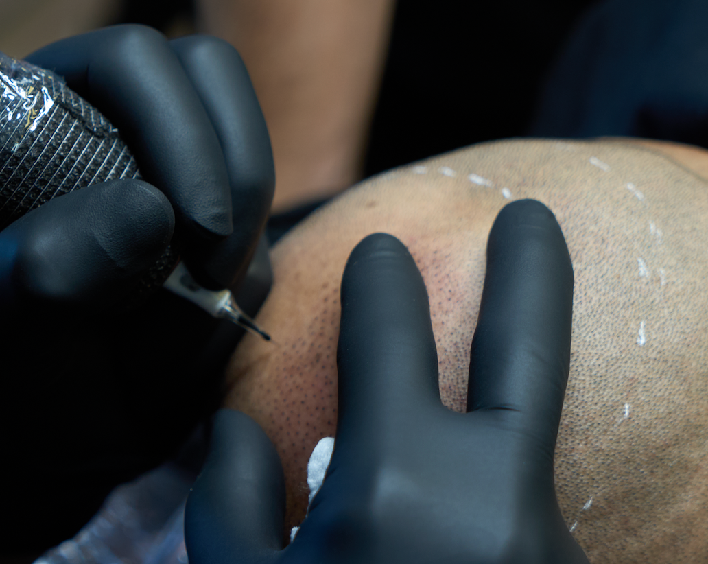 NACIMIENTO FOLICULAR a través de insertar pequeñas partículas de pigmento en la 1º capa de la piel (Epidermis). Creando un efecto rapado o de densidad.